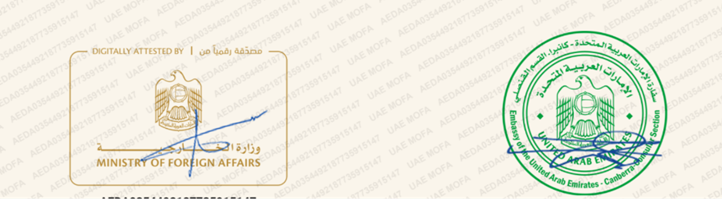 - 左侧认证印章在部分情况下体现阿联酋外交部(“MOFA”)的认证内容