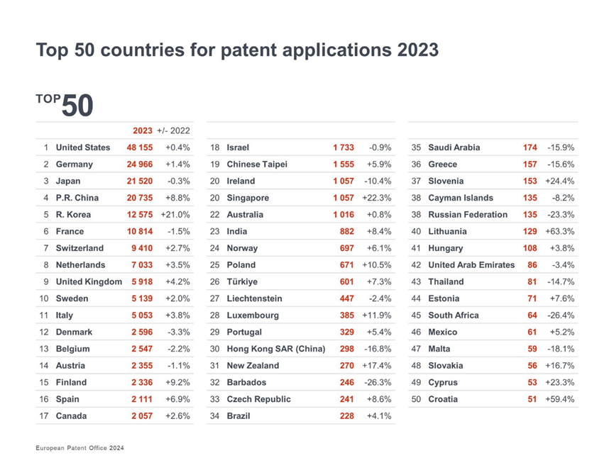 - الدول الخمس الأولى المصدرة لطلبات براءات الاختراع الأوروبية في عام 2023 هي: الولايات المتحدة وألمانيا واليابان والصين وكوريا الجنوبية. ومن بين جميع الطلبات، جاء 43% من الدول الأعضاء في الاتحاد الأوروبي البالغ عددها 39 دولة، في حين جاء 57% من دول أخرى خارج أوروبا. وارتفع عدد طلبات براءات الاختراع من الدول الأعضاء في الاتحاد الأوروبي البالغ عددها 39 دولة مرة أخرى بنسبة 1.8% ليصل إلى 85748، مع نمو أعلى من المتوسط في مجالات التكنولوجيا مثل الاتصالات الرقمية والتكنولوجيا الحيوية وتكنولوجيا الكمبيوتر والقياس.