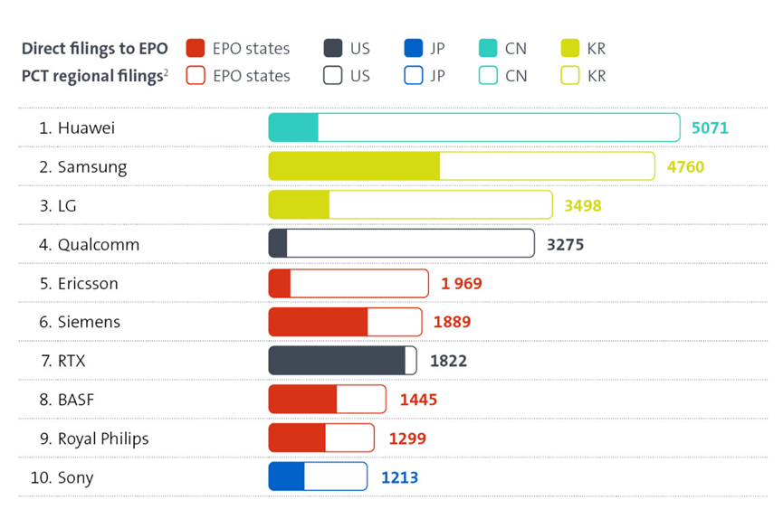 - ومن بينها، أصبحت شركة Huawei مرة أخرى هي مقدم الطلب الرئيسي، تليها Samsung وLG وQualcomm وEricsson. ومن بين أفضل 10 متقدمين، هناك 4 شركات من أوروبا، وشركتان من كوريا الجنوبية، وشركتان من الولايات المتحدة، وشركة واحدة من كل من الصين واليابان.