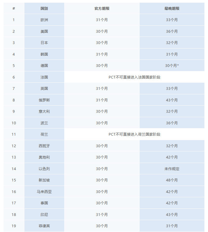 今天,页之码对于中国申请人主要30个目标国家的进入时限进行了总结。