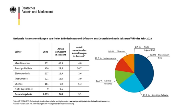 2023年,德国知识产权局DPMA共登记了1,835件独立发明人的专利申请,40.9%为机械工程领域,约四分之一的独立发明人来自巴伐利亚州(470件),女性发明人数量略高于2022年,比例略有上升,从 2022 年的 7.6% 上升到 8.7%。