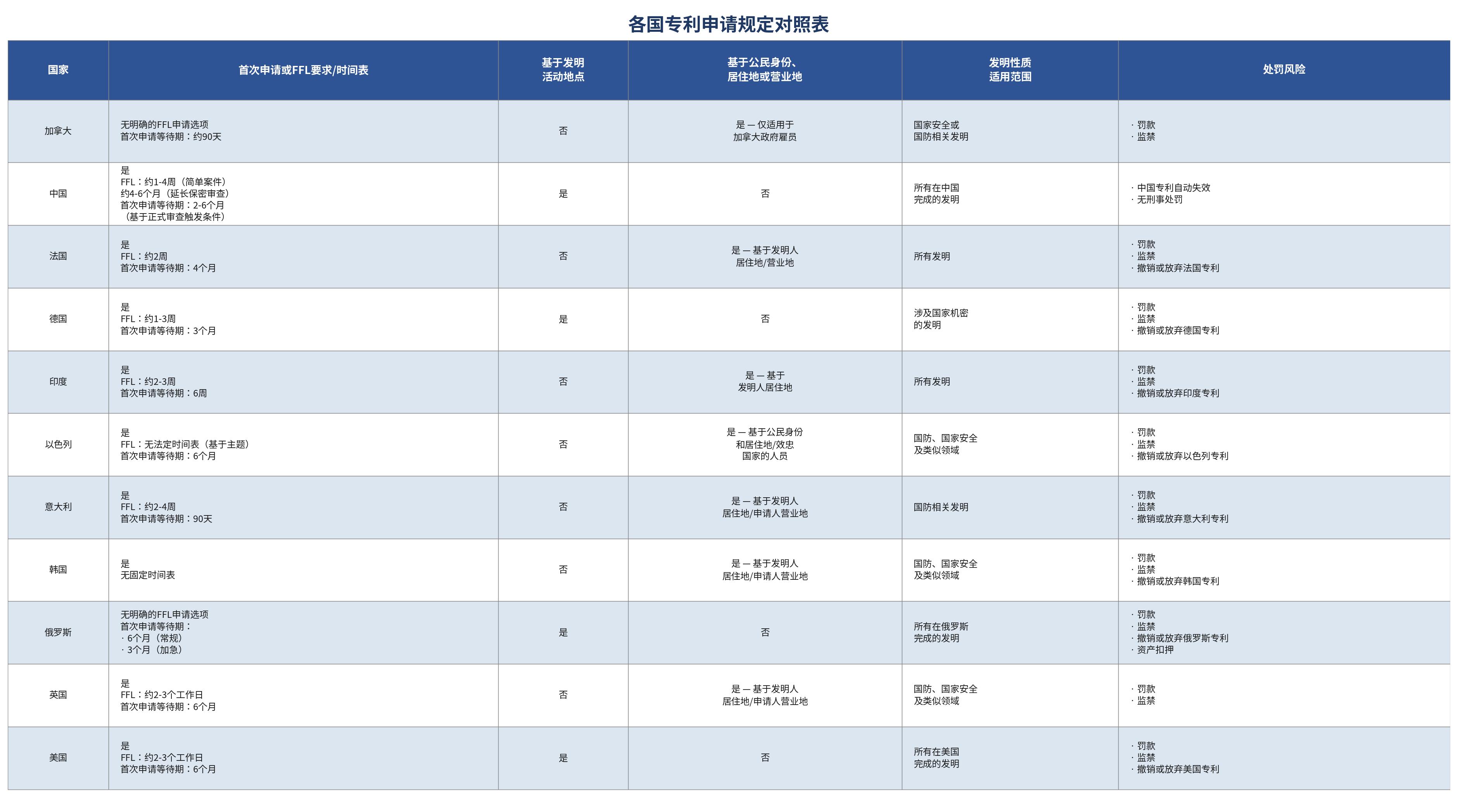 • 英国、意大利、韩国、以色列:多基于发明人居住地、申请人营业地或特定身份关系触发,但通常集中于国防、国家安全等敏感领域。