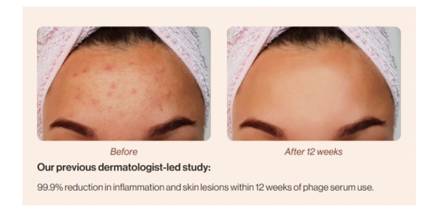 Phages are natural antimicrobials and promising ingredients for targeted skincare applications. They help rebalance the skin microbiome by selectively inactivating problematic bacteria. Their specificity makes them a potentially powerful component of a precision skincare regimen tailored to each person's unique skin microbiome. Parallel Health claims that phages are 99.9% effective in treating skin problems.