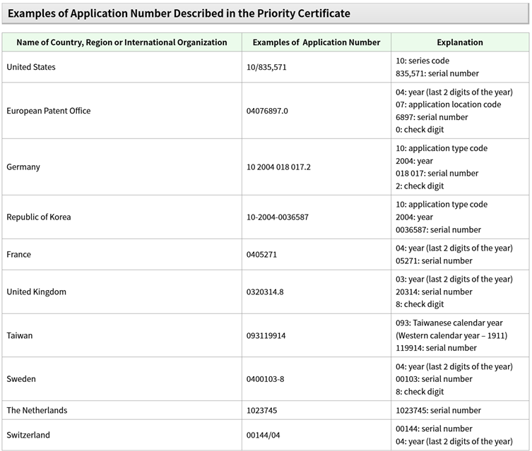 Desde 2004, con el fin de acelerar las búsquedas y los exámenes en varias oficinas de propiedad intelectual mediante el uso mutuo de los resultados de búsqueda de las solicitudes de patentes correspondientes, las Oficinas Trilaterales (la Oficina de Patentes de Japón, la Oficina Europea de Patentes y la Oficina de Patentes y Marcas de los Estados Unidos) han desarrollado el "Sistema de Acceso a Expedientes" que permite a los usuarios acceder a información de exámenes, como paquetes de documentos, en cada oficina. Al consultar información relacionada con el examen proporcionada por otras oficinas de PI a través del Sistema de acceso a expedientes, los examinadores de la JPO utilizan el número de solicitud de la solicitud extranjera. Para acelerar el proceso de examen, la JPO recomienda encarecidamente que los solicitantes describan correctamente el número de prioridad, como se muestra en la siguiente tabla:
