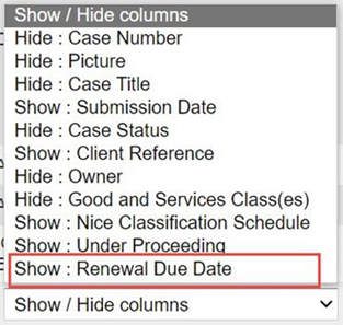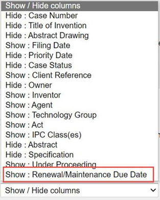 Les utilisateurs peuvent sélectionner la liste déroulante [Afficher/Masquer les colonnes] au bas des résultats de recherche, puis sélectionner l'option [Afficher : Date d'échéance de la taxe annuelle] ou [Afficher la date d'échéance de la taxe annuelle/de la taxe de maintenance] pour rechercher un brevet. La date d'expiration des frais annuels/frais de maintenance est affichée.