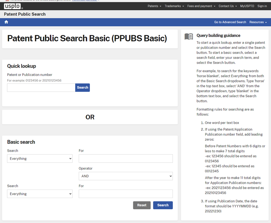 La barre de recherche en haut de la page vous permet d'effectuer une recherche en utilisant CPC comme mot-clé, et vous pouvez également trouver des informations sur les brevets et les marques dans la colonne « Recherche rapide », qui est le principal avantage de l'USPTO. En tant que site Web gouvernemental, tous les brevets ont un statut précis et à jour. Bien que l'interface soit très simple et que le site Web ne soit pas adapté à l'analyse des brevets, le statut juridique exact de chaque brevet est disponible ainsi qu'une description détaillée.