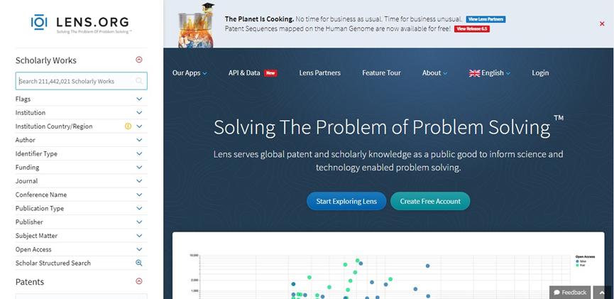 Lens.org est un projet de base de données open source développé en collaboration entre Cambia et l'Université de technologie du Queensland. Il a débuté en 2000 et stocke actuellement plus de 119 millions de documents provenant de 105 juridictions. L’une des principales caractéristiques qui distingue Lens.org des autres sites est qu’il fournit aux utilisateurs des données de citation et de la littérature non brevetée. Lens.org dispose d'une interface utilisateur claire et conviviale. Bien qu'elle dispose de fonctions complexes, la page Web n'est pas du tout encombrée.