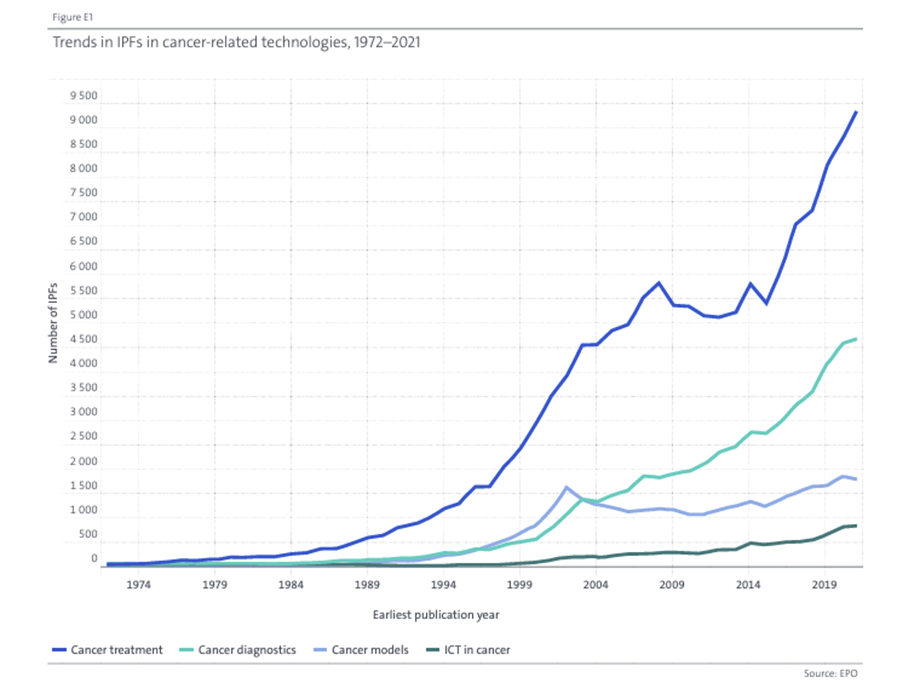 Depuis 1970, plus de 140 000 inventions anticancéreuses ont été annoncées au public. Entre 2015 et 2021, les familles de brevets internationaux ont augmenté de plus de 70 %, pour atteindre plus de 13 000 familles de brevets en 2021. Cette croissance est principalement due au développement accéléré de technologies de traitement du cancer telles que l’immunothérapie, la thérapie génique et les acides nucléiques non codants, ainsi que du diagnostic du cancer, en particulier de nouvelles technologies telles que les biopsies liquides et l’informatique de la santé.