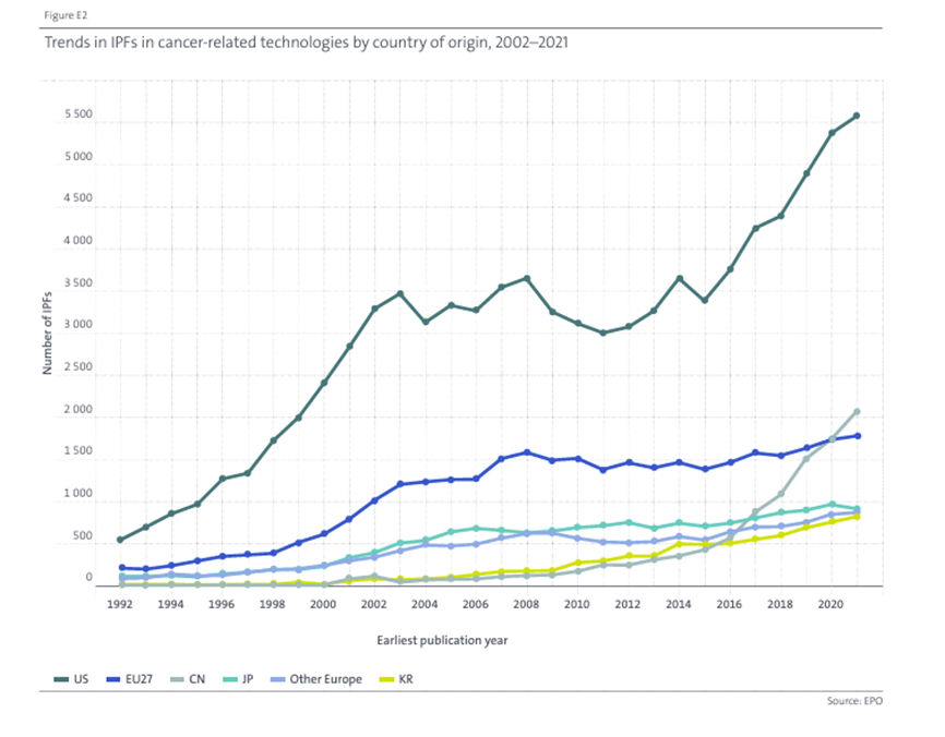 De 2022 à 2021, près de 50 % des familles de brevets ont été déposées par des demandeurs américains. En particulier entre 2015 et 2021, les demandeurs américains ont apporté une contribution considérable à l'accélération de l'innovation liée au cancer, tandis que les 27 pays de l'UE représentaient 18 % en deuxième position, avec le Japon. représentant 9%. Mais depuis 2021, les demandeurs chinois ont dépassé les 27 pays de l’UE avec des demandes de brevet pour plus de 2 000 familles de brevets, devenant ainsi le deuxième plus grand contributeur à l’innovation anti-cancer dans le monde.