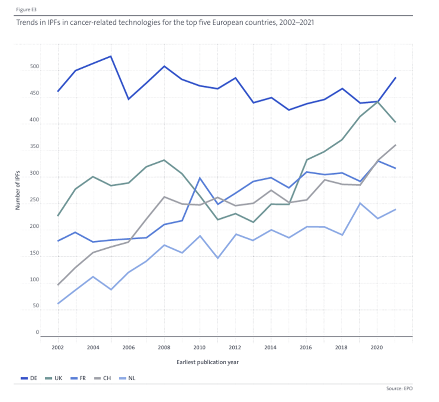 Parmi les pays européens, les déposants allemands sont restés leaders en matière d'innovation anti-cancer au cours des 20 dernières années, avec un total de 9 000 familles de brevets entre 2002 et 2021, tandis que le Royaume-Uni a connu une forte croissance au cours des 10 dernières années, devenant ainsi le numéro 1. .1 famille de brevets ces dernières années. La France, la Suisse et les Pays-Bas sont les deux plus grands contributeurs de familles de brevets.