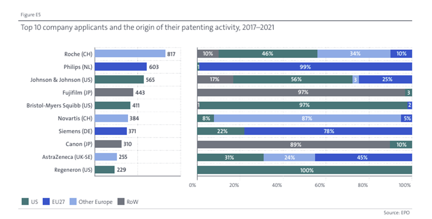 De 2017 à 2021, les 10 principales entreprises candidates au monde comprennent 5 sociétés européennes, 2 sociétés japonaises et 3 sociétés américaines. La société suisse Roche occupe la première place, tandis que Philips, Fujifilm, Siemens et Canon se concentrent davantage sur le diagnostic.