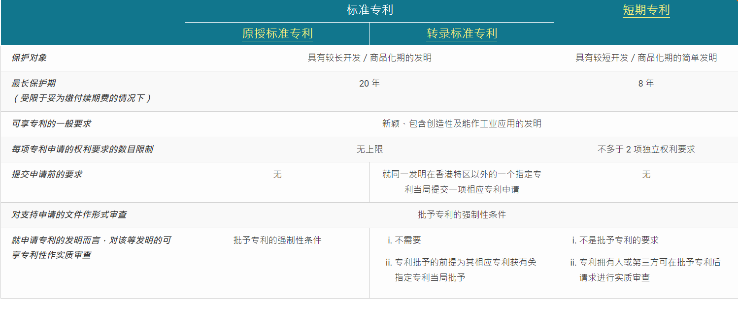 홍콩의 지적 재산권 시스템은 본토와 매우 다르며, 홍콩이 공포한 특허 조례 및 등록 디자인 조례에 따르면 홍콩에는 발명 특허와 디자인 특허라는 두 가지 유형의 특허가 있습니다. 발명특허는 제출방법에 따라 OGP(Original Grant Patent), 전사표준특허, 단기특허 등 3가지 유형으로 구분된다. Original-grant 특허란 Original-grant 특허제도에 도입된 표준특허를 말하며 직접출원을 통해 허가가 가능하고 형식적, 실체적 심사를 거쳐야 하며 보호기간은 최대 20년이다. 디자인 특허는 최초 5년 동안 보호받을 수 있으며, 5년마다 갱신할 수 있으며 최대 보호 기간은 25년입니다. 표준 특허를 복사하기 위한 전제 조건은 신청자가 먼저 3개의 특허청, 즉 국가 지적 재산권청, 영국 지적 재산권청 또는 유럽 특허청 중 하나에 영국 특허 출원을 명시하여 이전에 해당하는 특허 출원을 제출해야 한다는 것입니다. , 홍콩지식재산권보호국은 이러한 유형의 특허출원에 대해서만 정식 심사를 실시하며 최대 보호 기간은 20년입니다. 단기특허출원은 독립항을 최대 2개까지만 포함할 수 있으며, 종속항의 개수에는 제한이 없으며, 정식심사만 실시하며, 최대 보호기간은 8년이다.